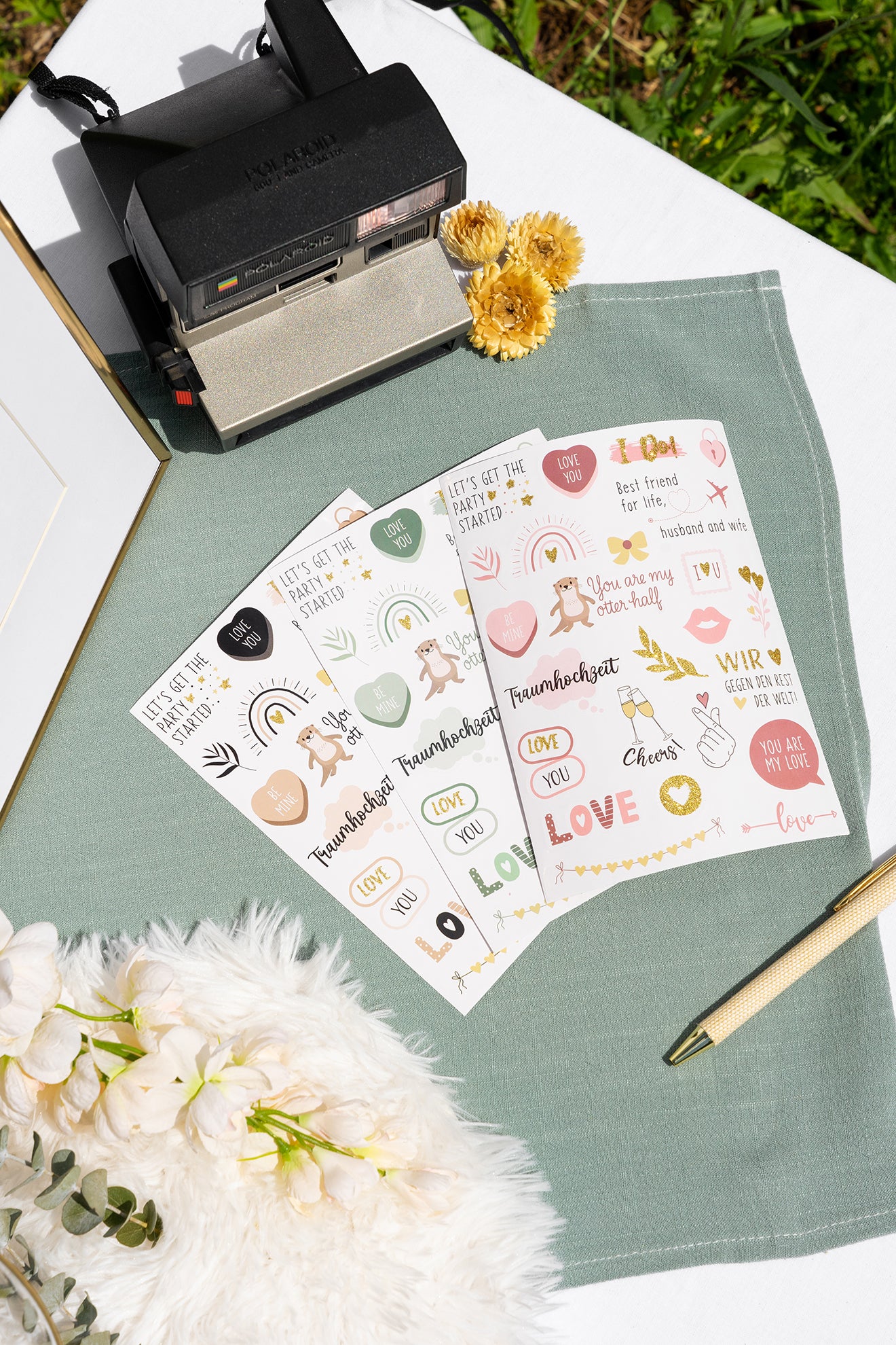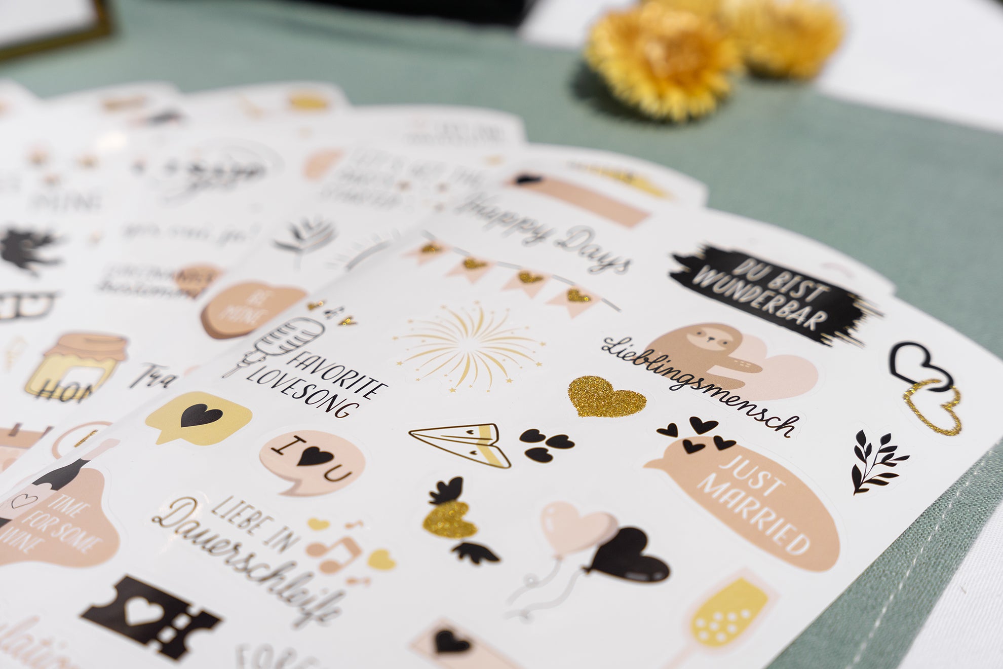 Das Stickerset ist von keiner Hochzeit wegzudenken. Sowohl im Hochzeitsalbum, als auch in Gästebüchern und auf Einladungskarten sind die Sticker eine liebevolle Dekoration, die jede Erinnerung an die Hochzeit versüßen.