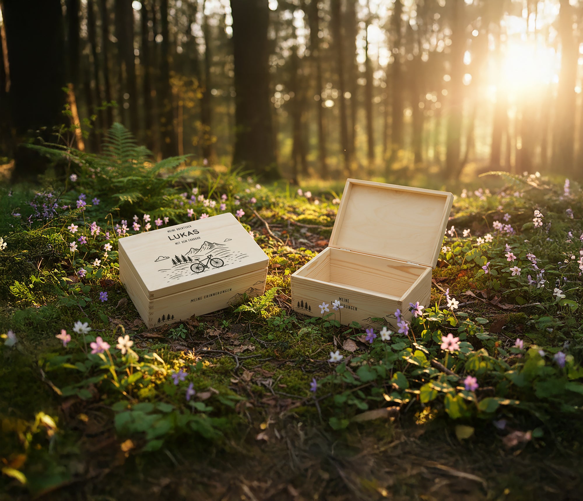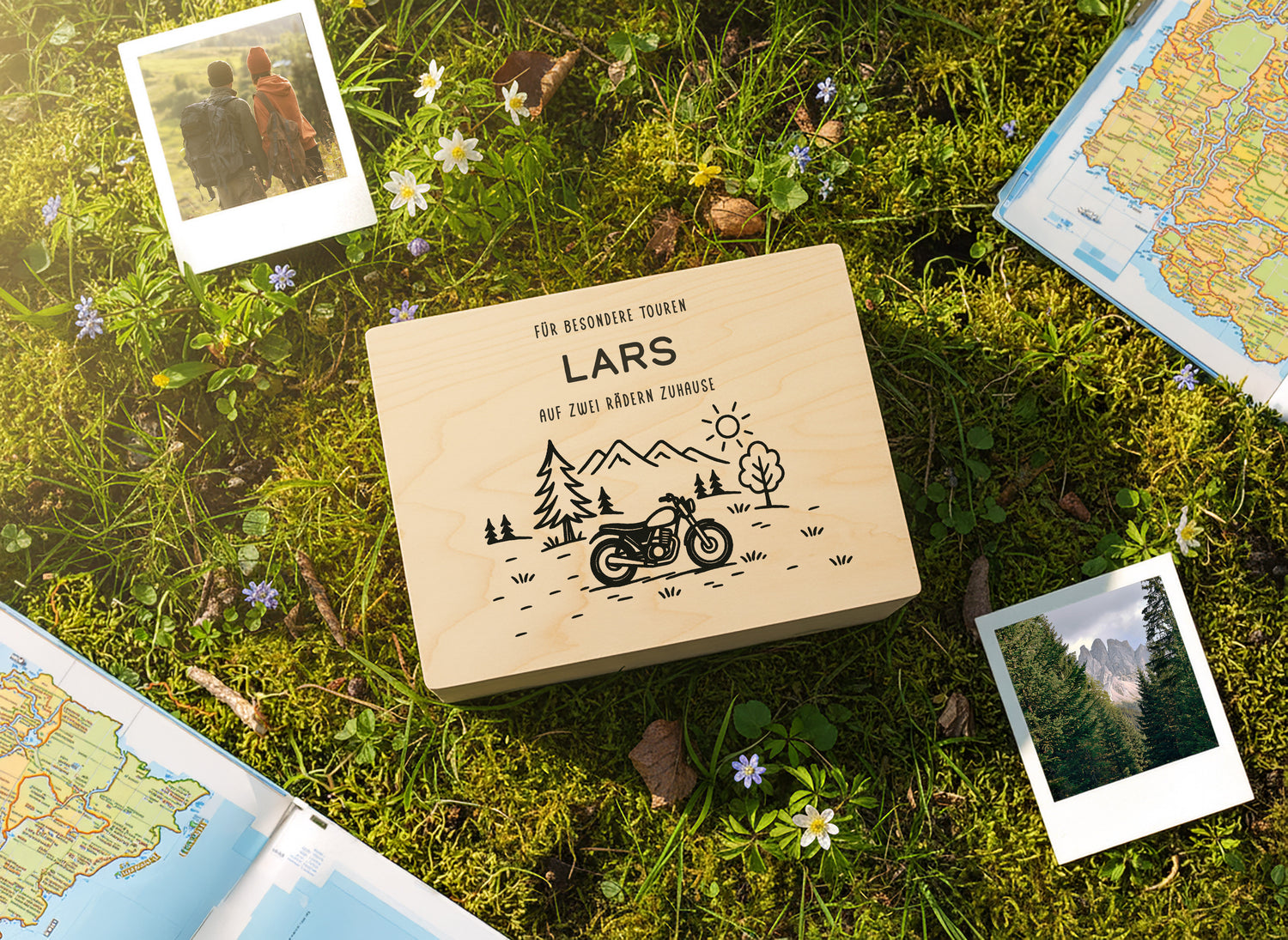 Wähle zwischen Angeln, Jagen, BBQ, Fahrrad, Motorrad, Camping oder Wandern. Jede Kiste wird mit einem liebevoll gestalteten Hobby-Icon veredelt.