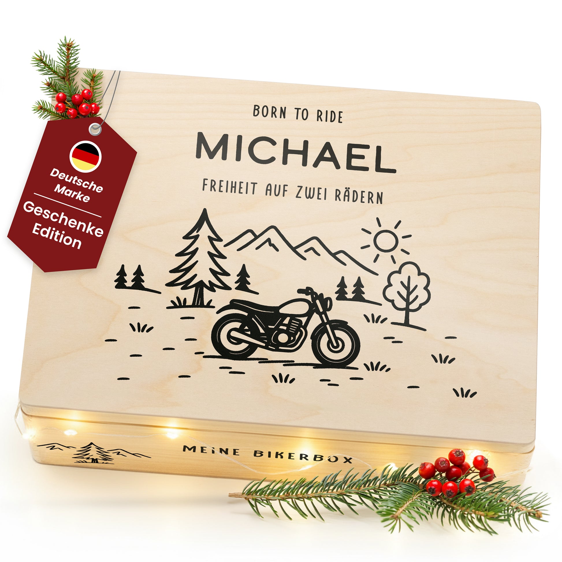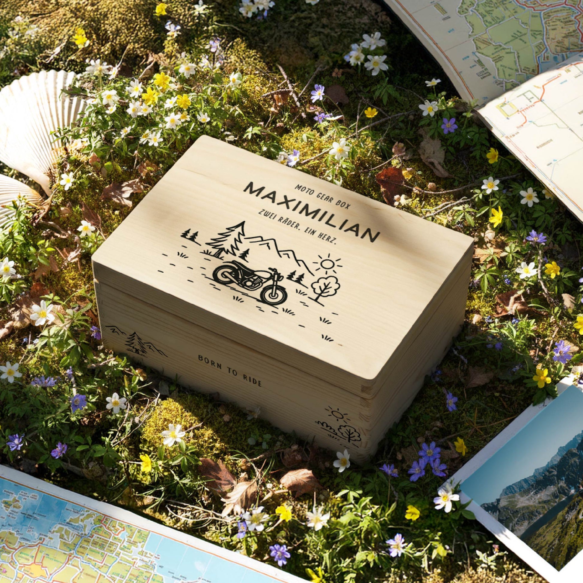 Wähle zwischen Angeln, Jagen, BBQ, Fahrrad, Motorrad, Camping oder Wandern. Jede Kiste wird mit einem liebevoll gestalteten Hobby-Icon veredelt.