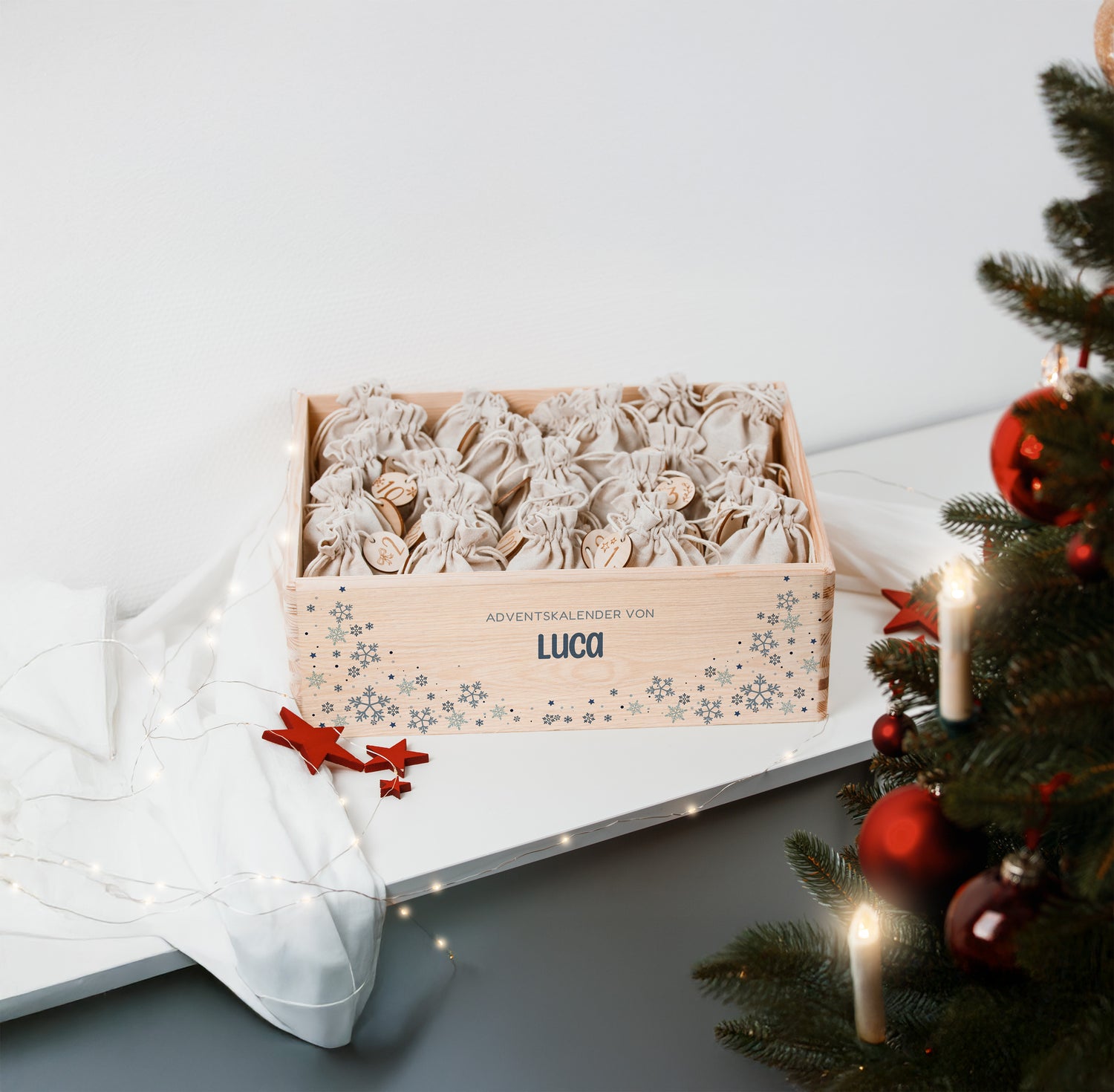 Mit diesem personalisierbaren Adventskalender zauberst du besondere Momente in die Vorweihnachtszeit. Gestalte deine Adventskiste individuell und erschaffe eine festliche Überraschung für deine Liebsten.