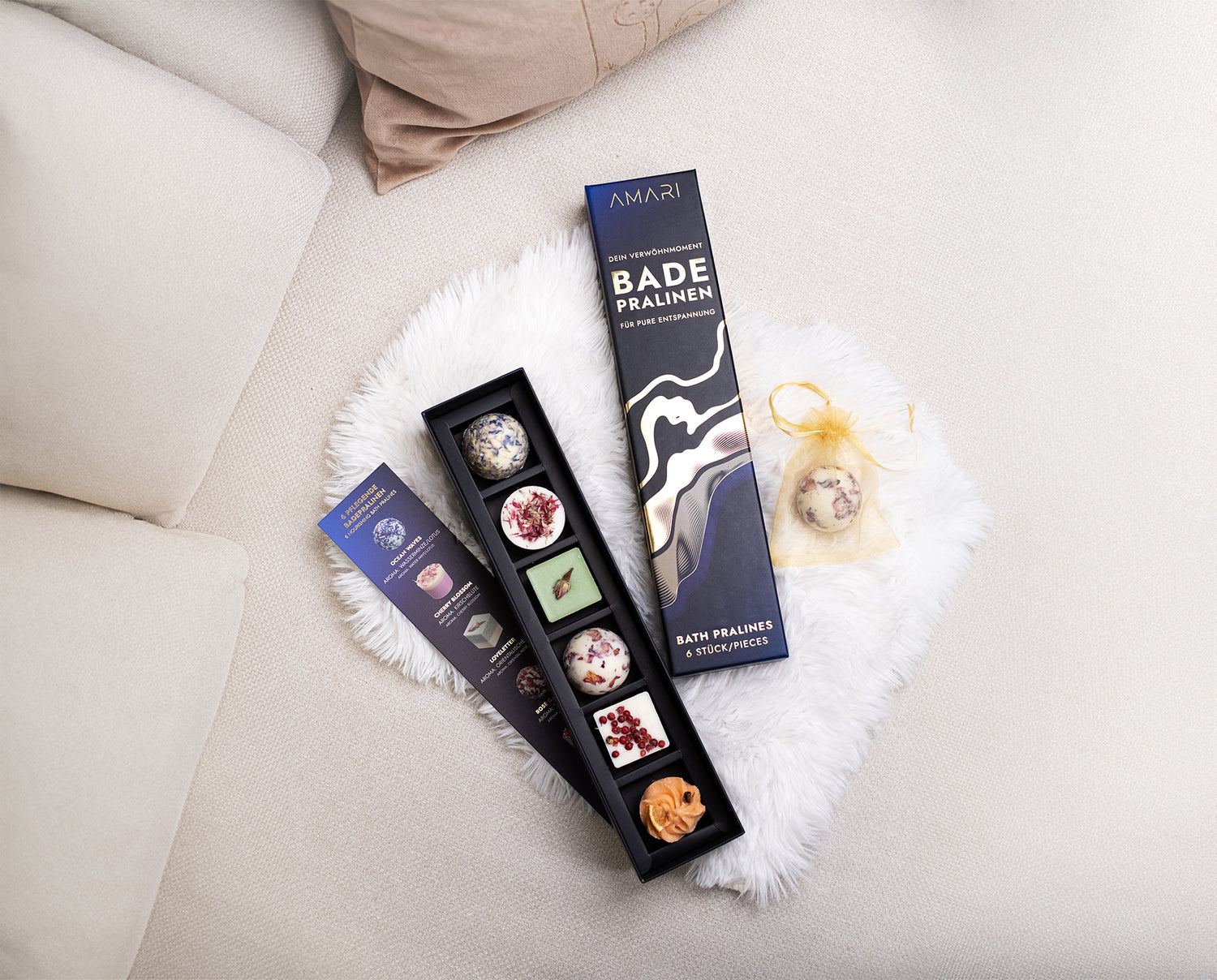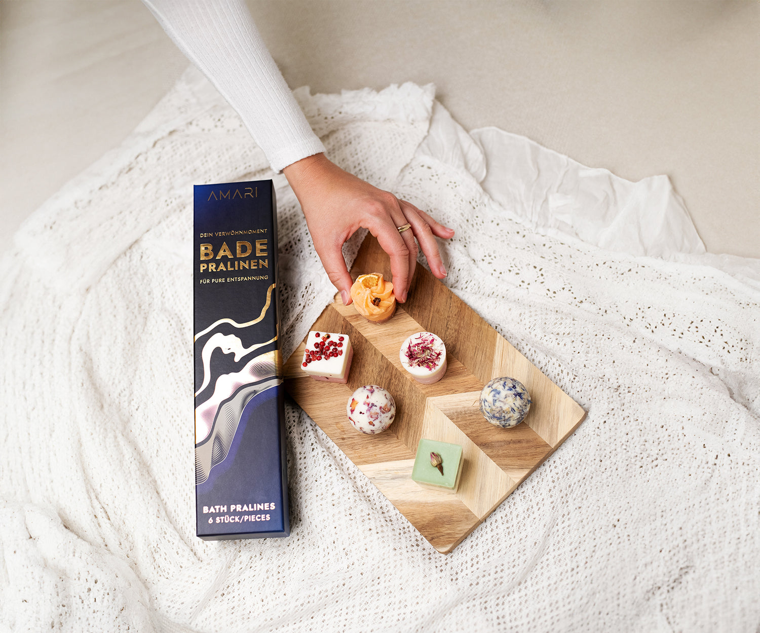 6 handverlesene Badepralinen bieten für jede Stimmung das richtige Aroma.