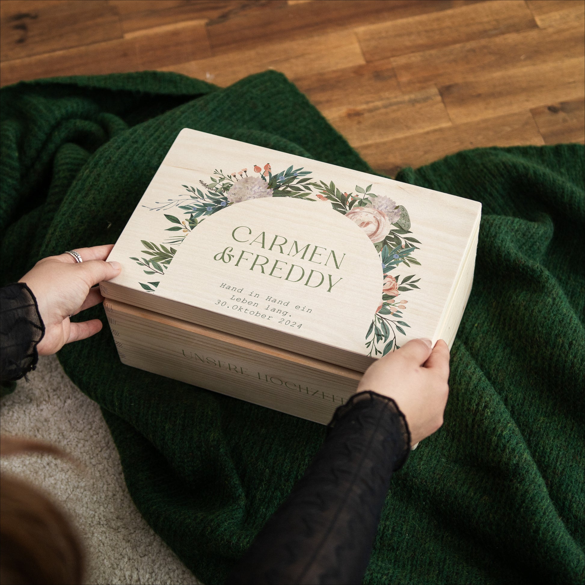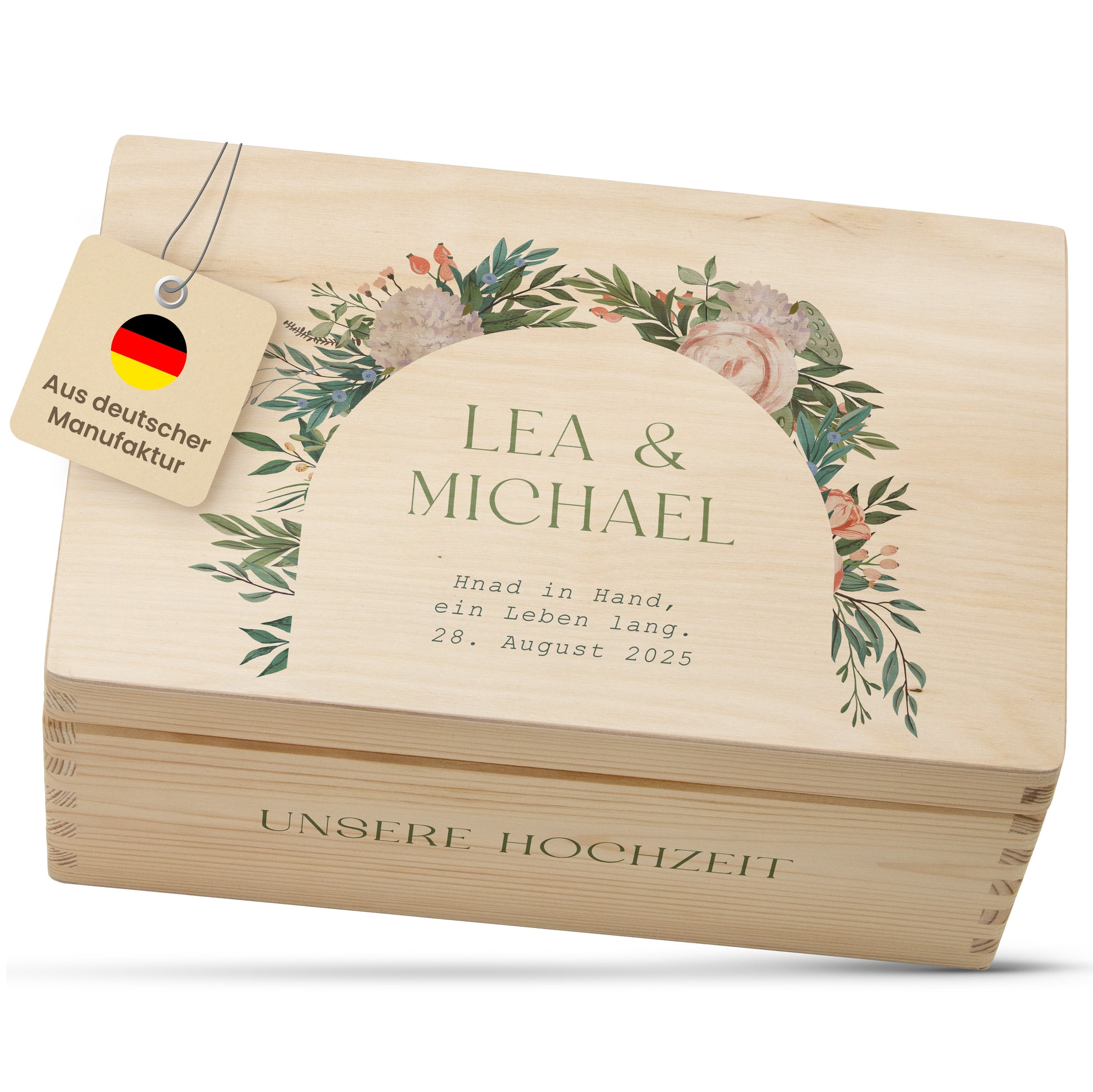 Personalisiere mit Namen & Datum. Jede Kiste erzählt eine ganz persönliche Geschichte, perfekt für besondere Anlässe wie Hochzeiten, Verlobungen oder Junggessellenenabschiede.