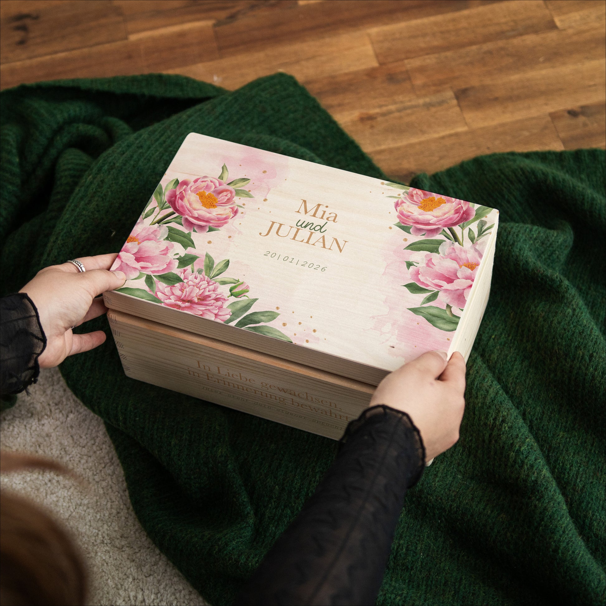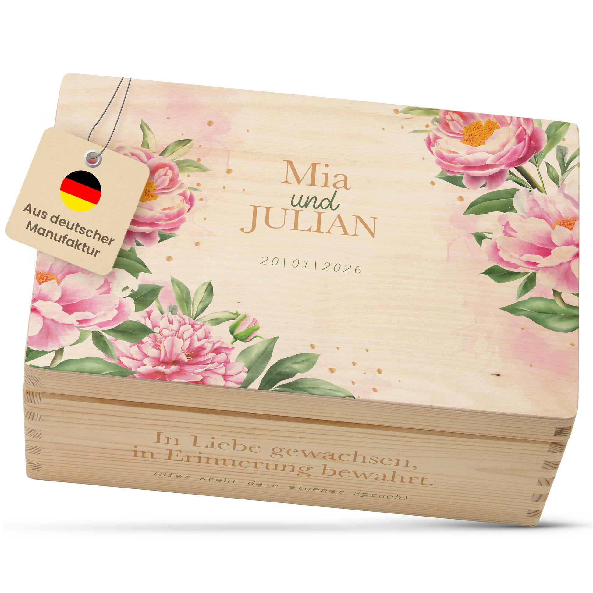 Personalisiere mit Namen & Datum. Jede Kiste erzählt eine ganz persönliche Geschichte, perfekt für besondere Anlässe wie Hochzeiten, Verlobungen oder Junggessellenenabschiede.