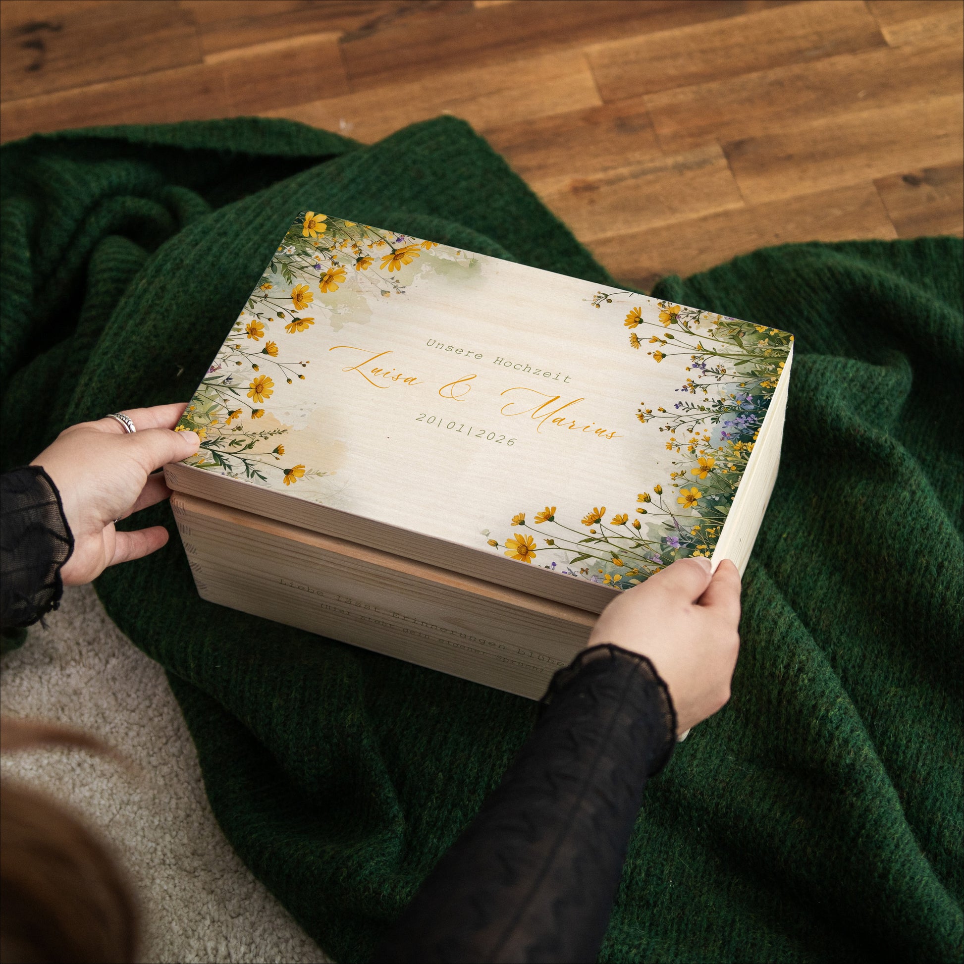 Schenke etwas Besonderes! Diese personalisierte Kiste ist das perfekte Geschenk für Braut und Bräutigam, um all ihre wertvollen Hochzeitsandenken sicher aufzubewahren.