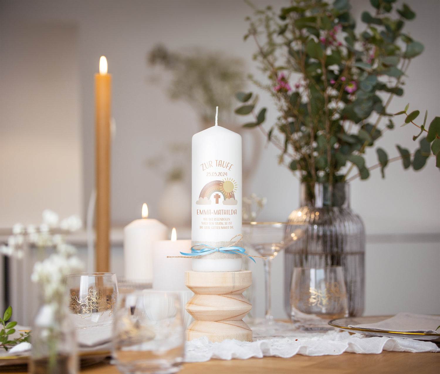 Personalisiere mit Name, Datum und einem individuellen Schleifenband. Jede Kerze erzählt eine ganz persönliche Geschichte, perfekt für besondere Anlässe wie Hochzeiten, Taufen, Kommunion und mehr.