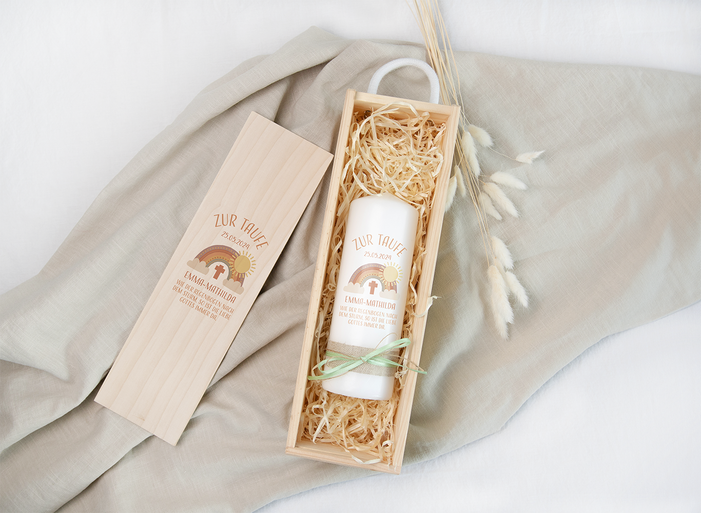 - Kerzenbox: Optional kannst du eine Kerzenbox aus Holz dazu bestellen. Diese wird mit dem Motiv deiner Kerze versehen und dient als Geschenkverpackung oder Aufbewahrungsbox.